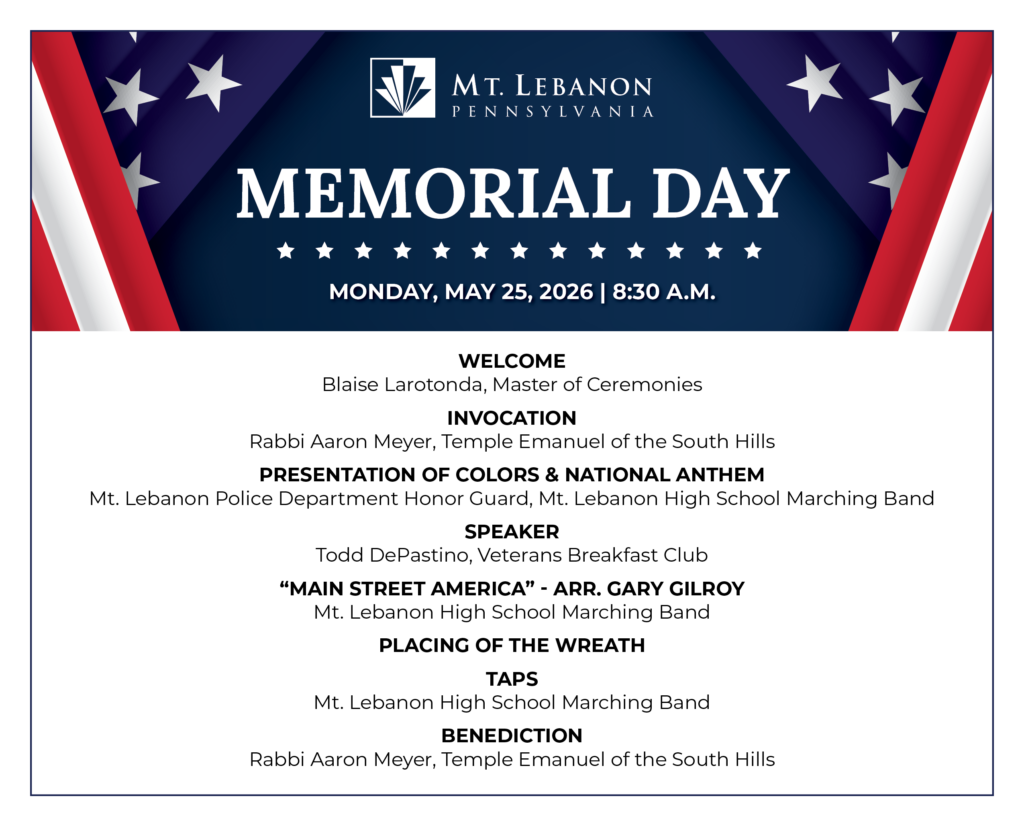 Help us remember those who made the ultimate sacrifice for our freedom at Mt. Lebanon’s Memorial Day ceremony, Monday, May 26 at 8:30 a.m., at the Veterans Memorial, in Mt. Lebanon Park, near the recreation center.